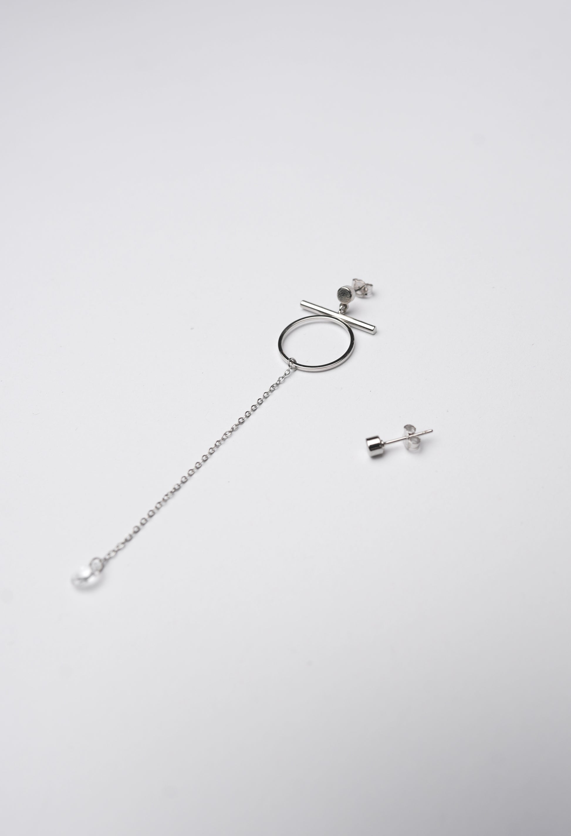 The lightweight and elegant asymmetric Amega earrings. Made from high-quality brass with rhodium plating and a Swarovski crystal.