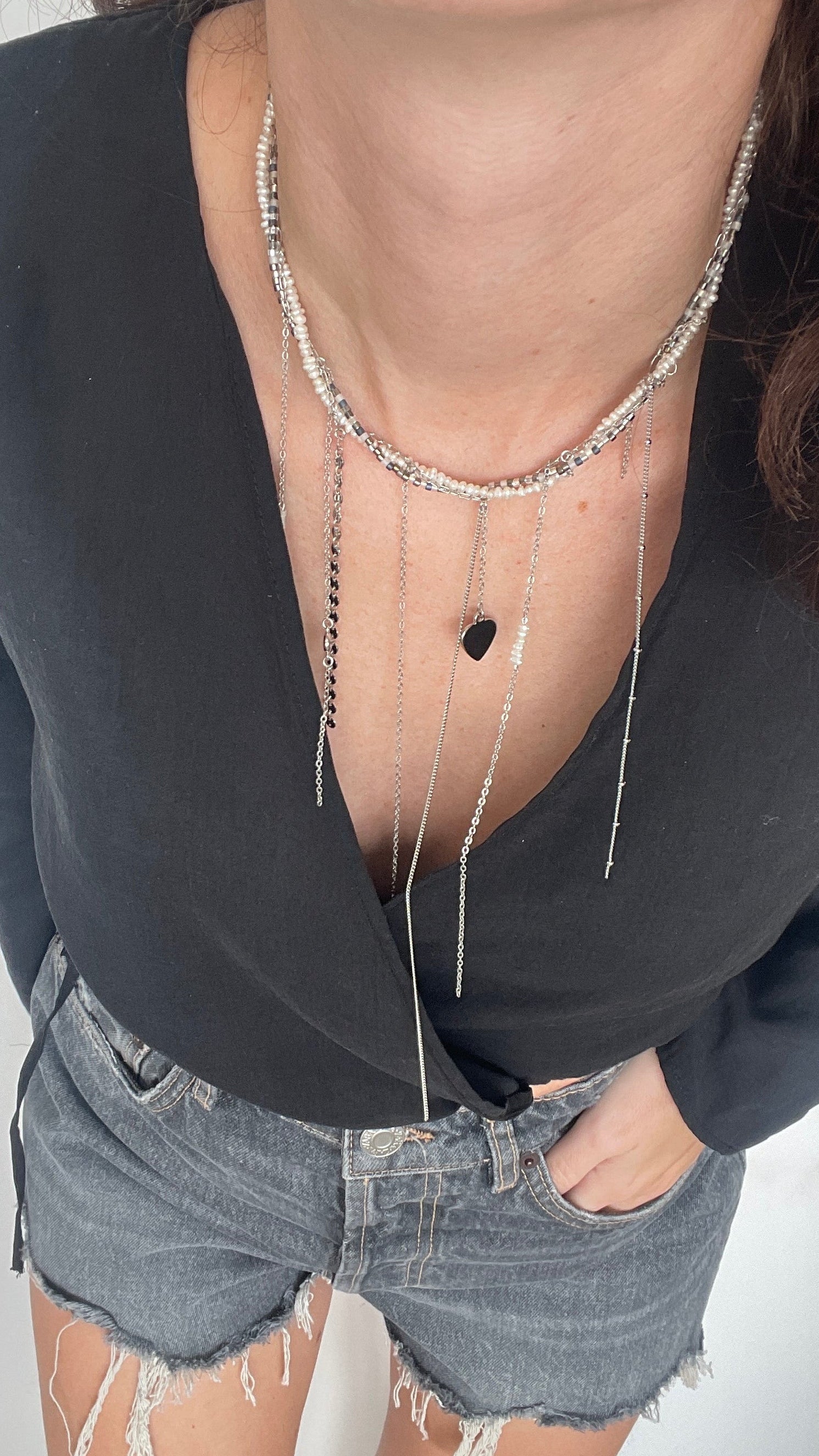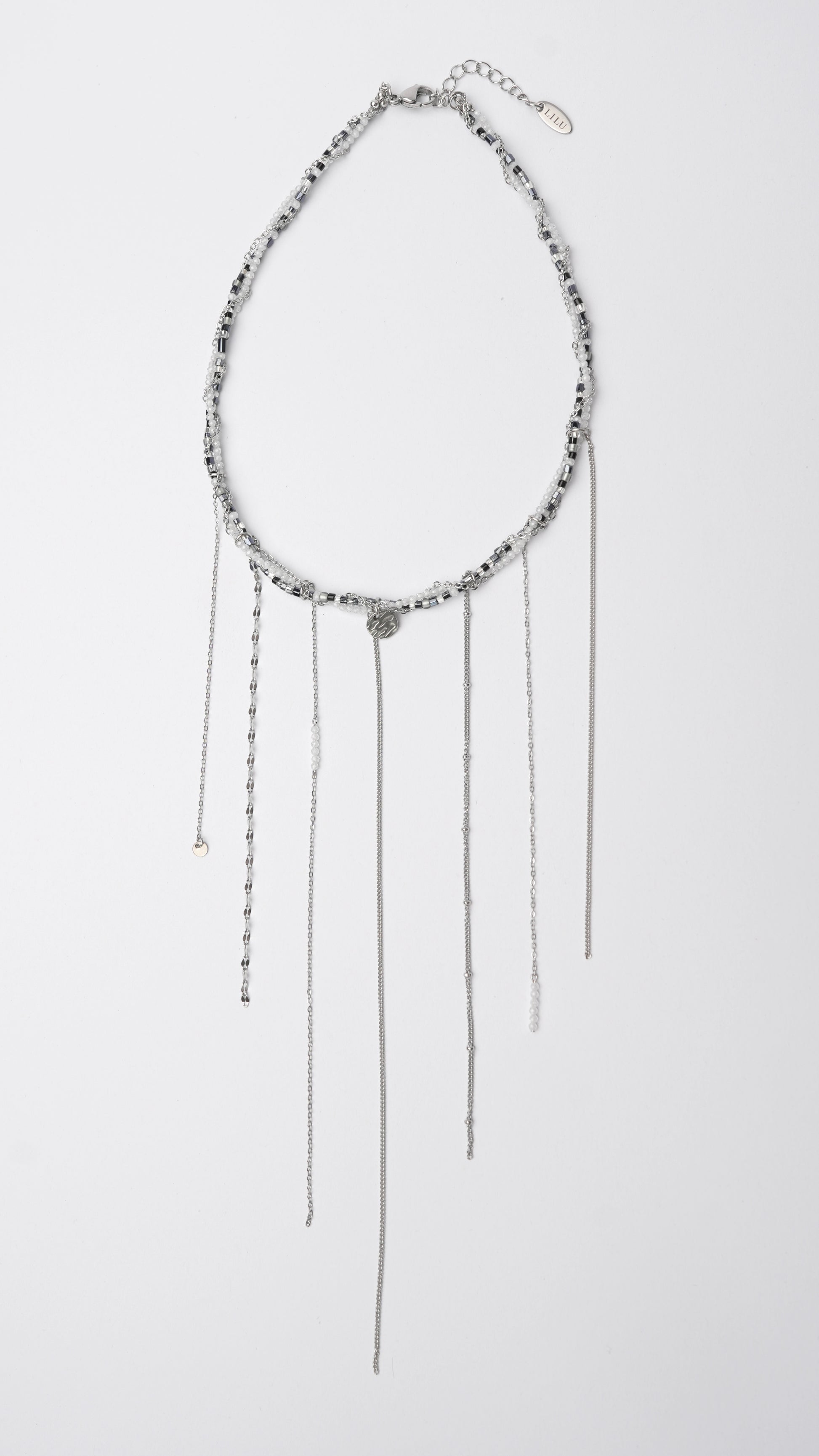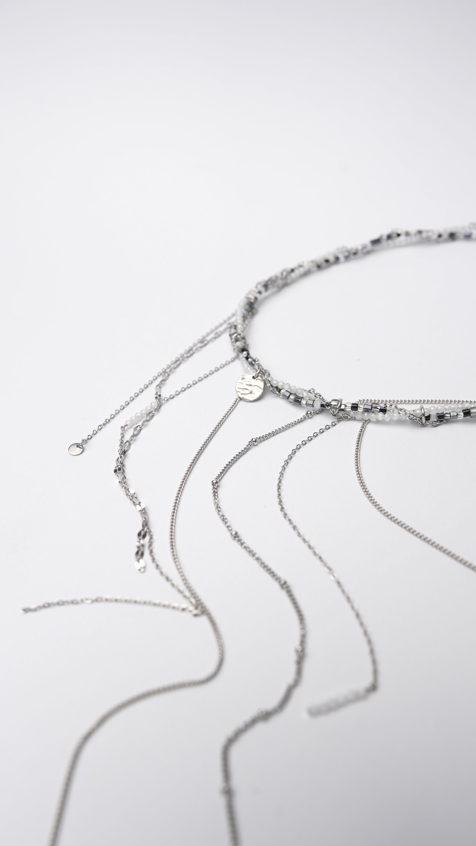Stylish 3-rows necklace with sparkling tiny zircon beads and long chains.