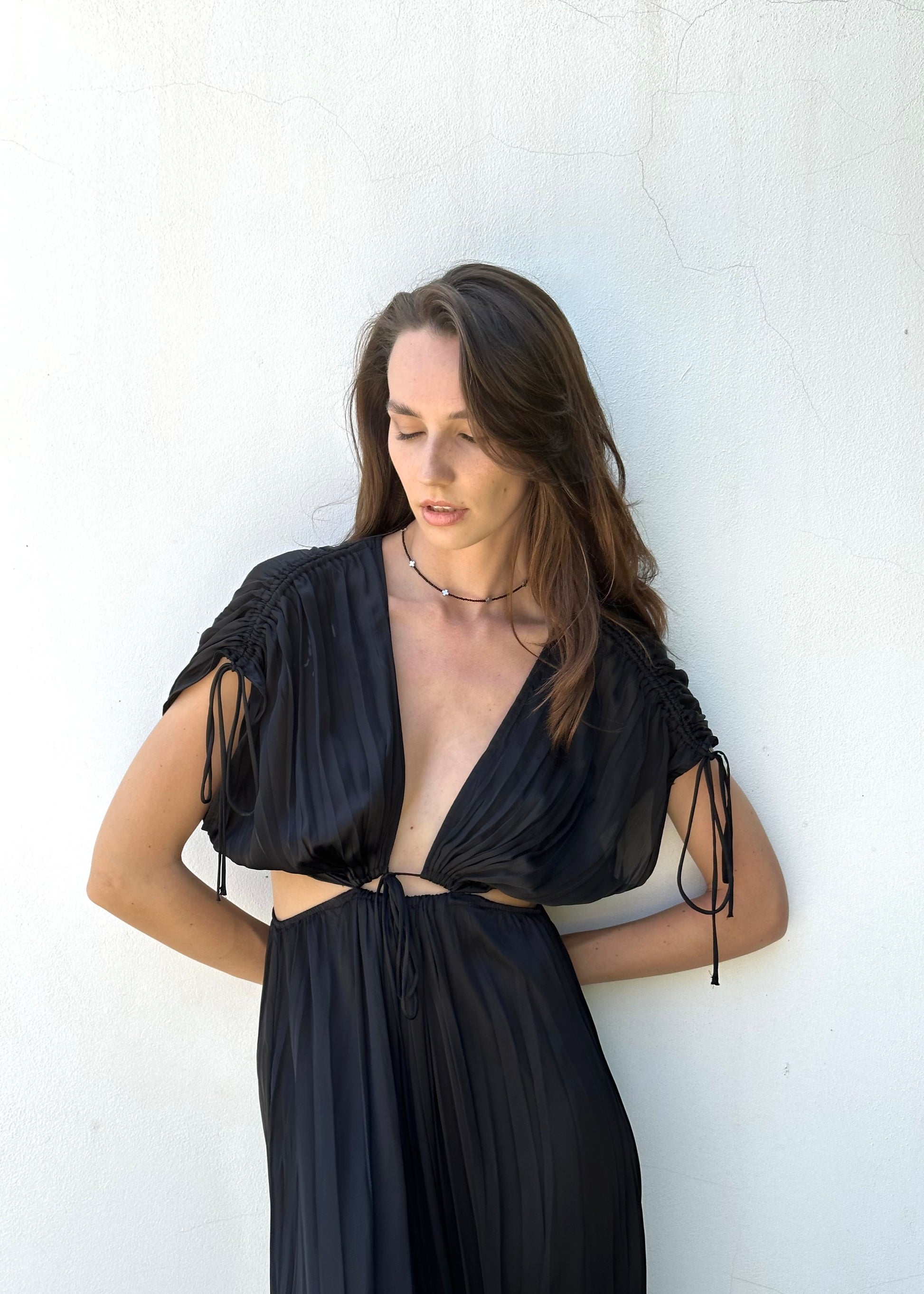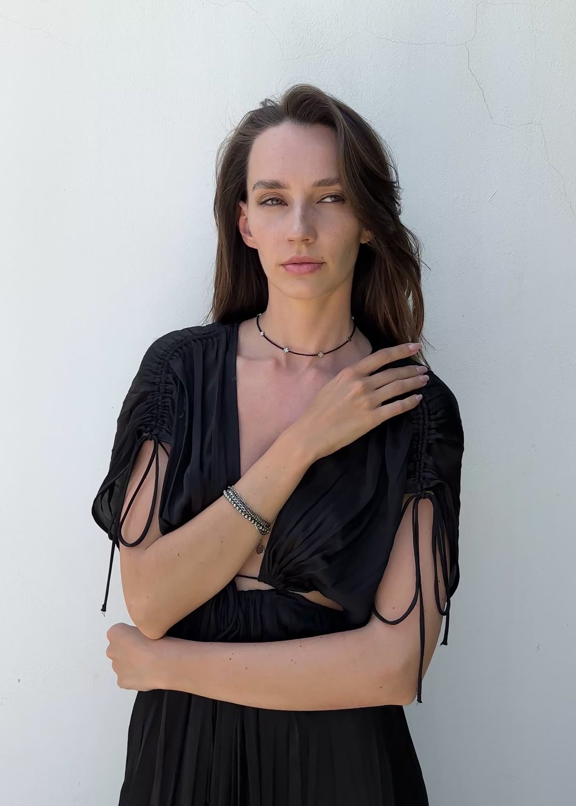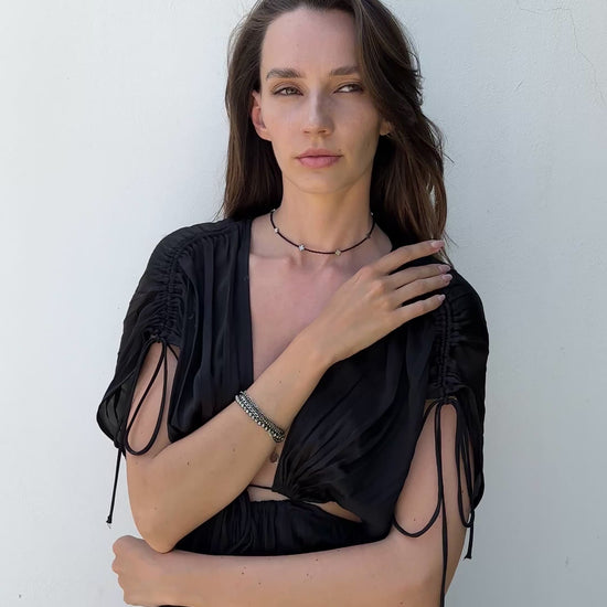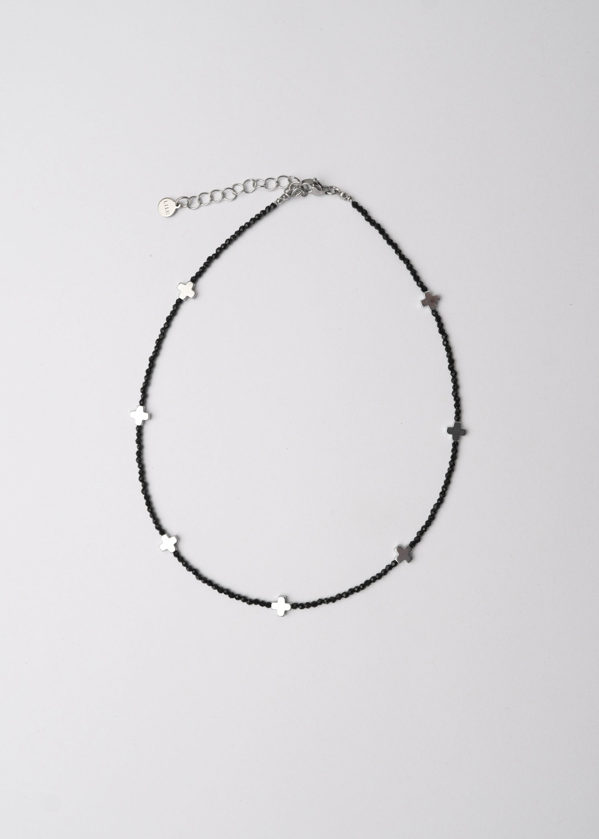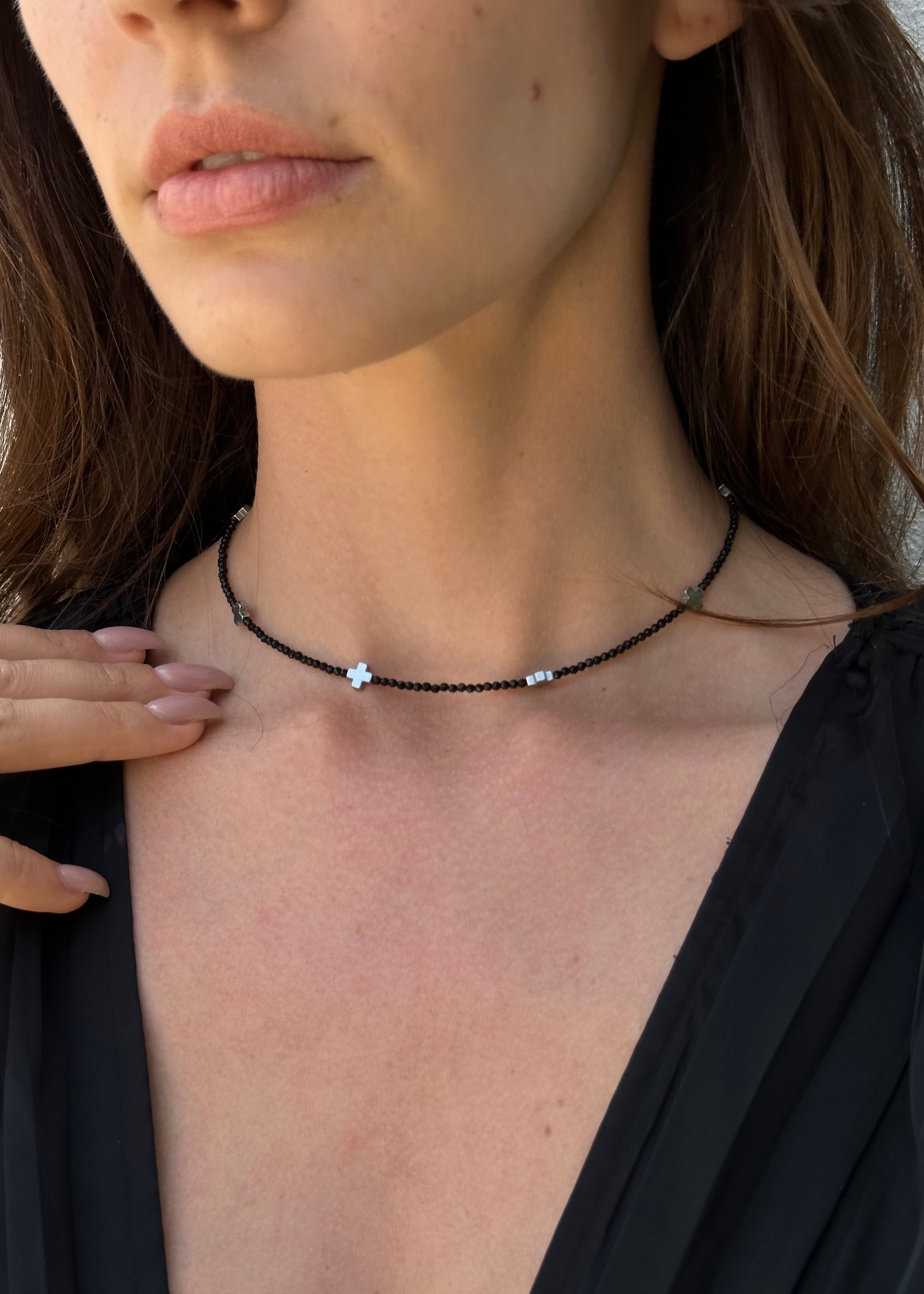 Stylish minimalistic choker with black spinel and hematite cross beads.