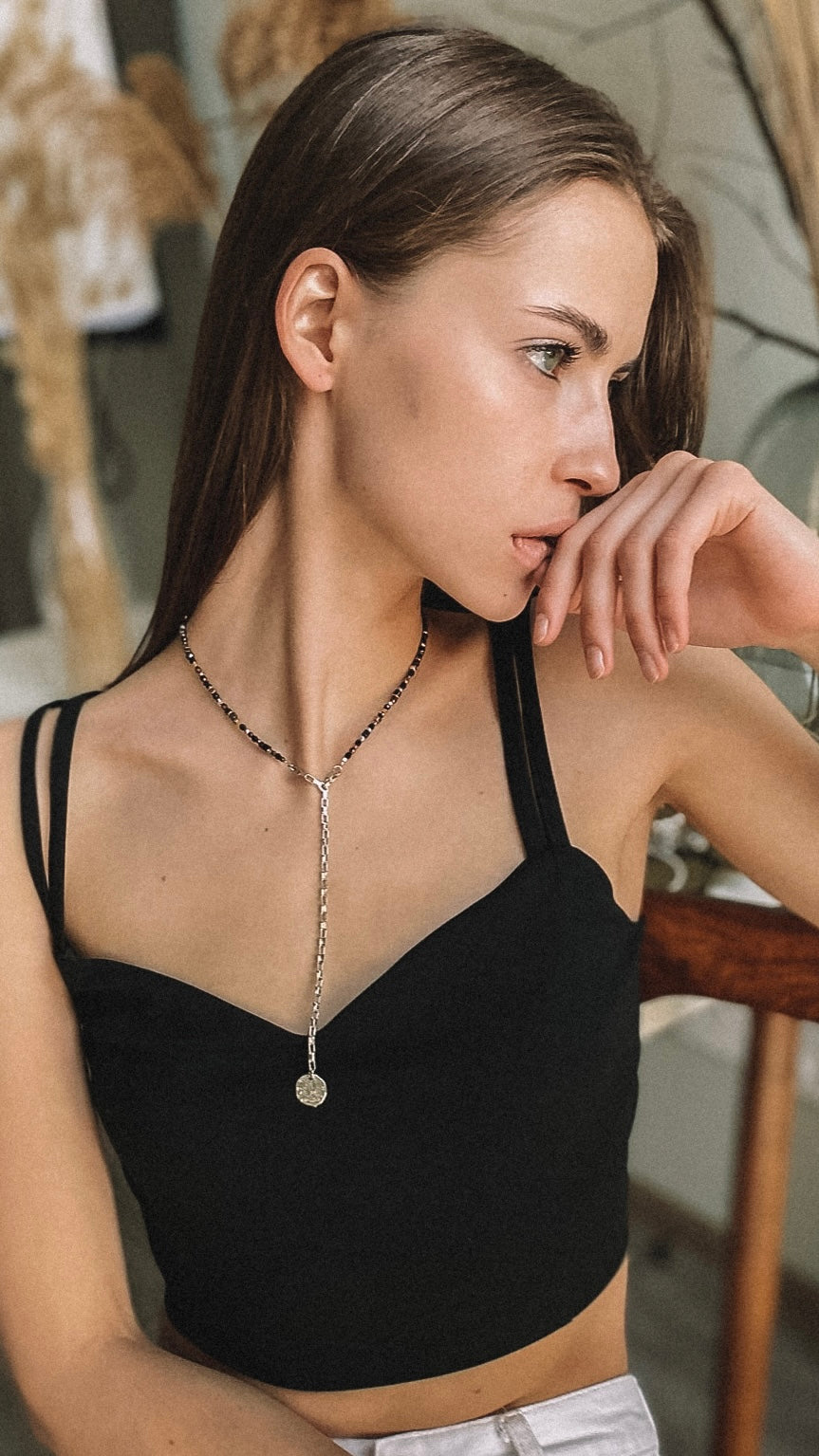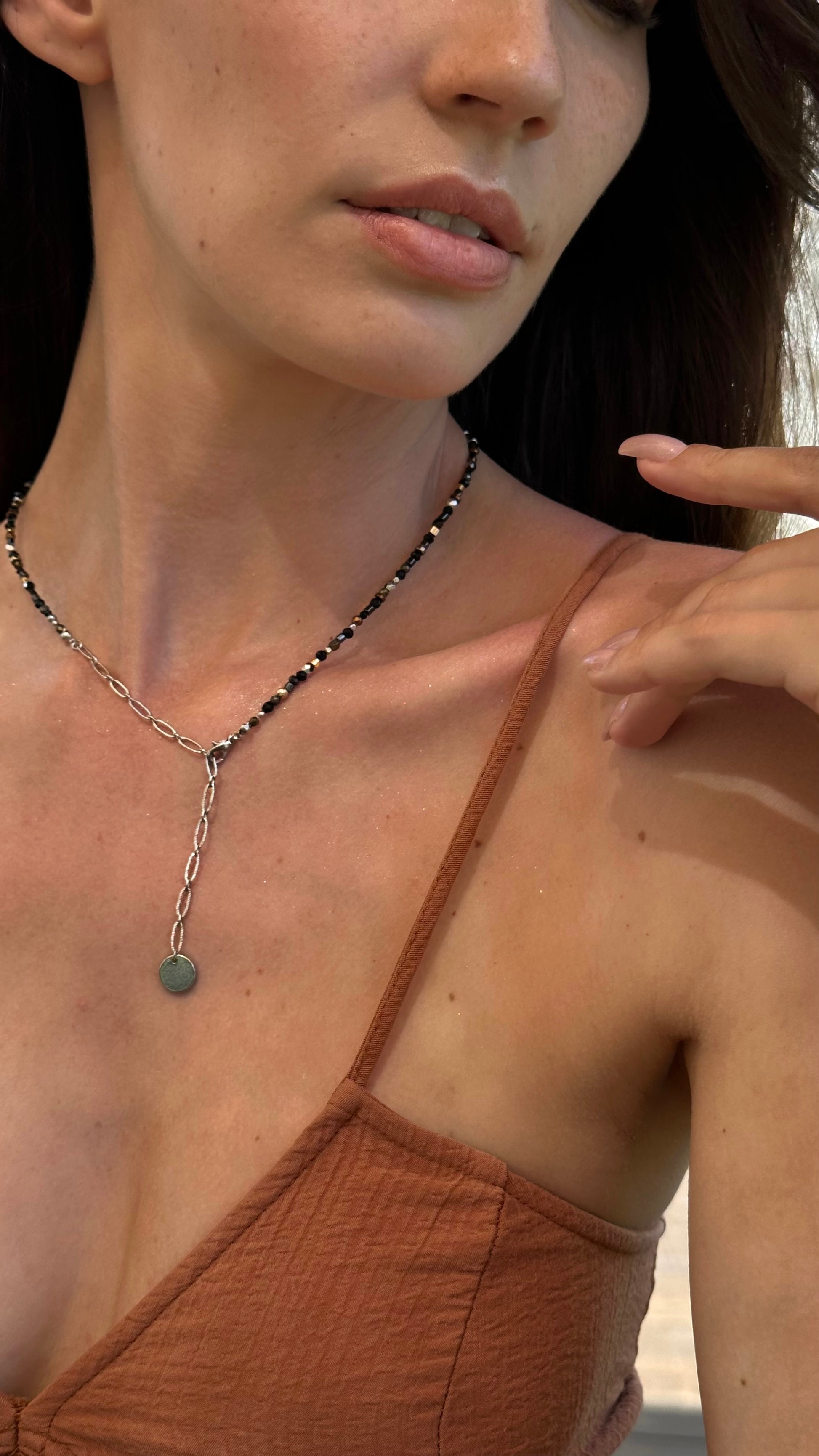 Can be worn with the clasp at the back like a classic choker, or with the pendant in front for a playful twist.