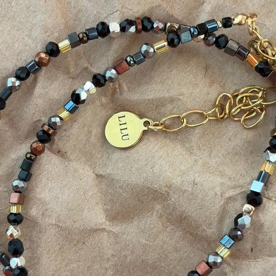 Dramatic choker in black, gold and silver colors.