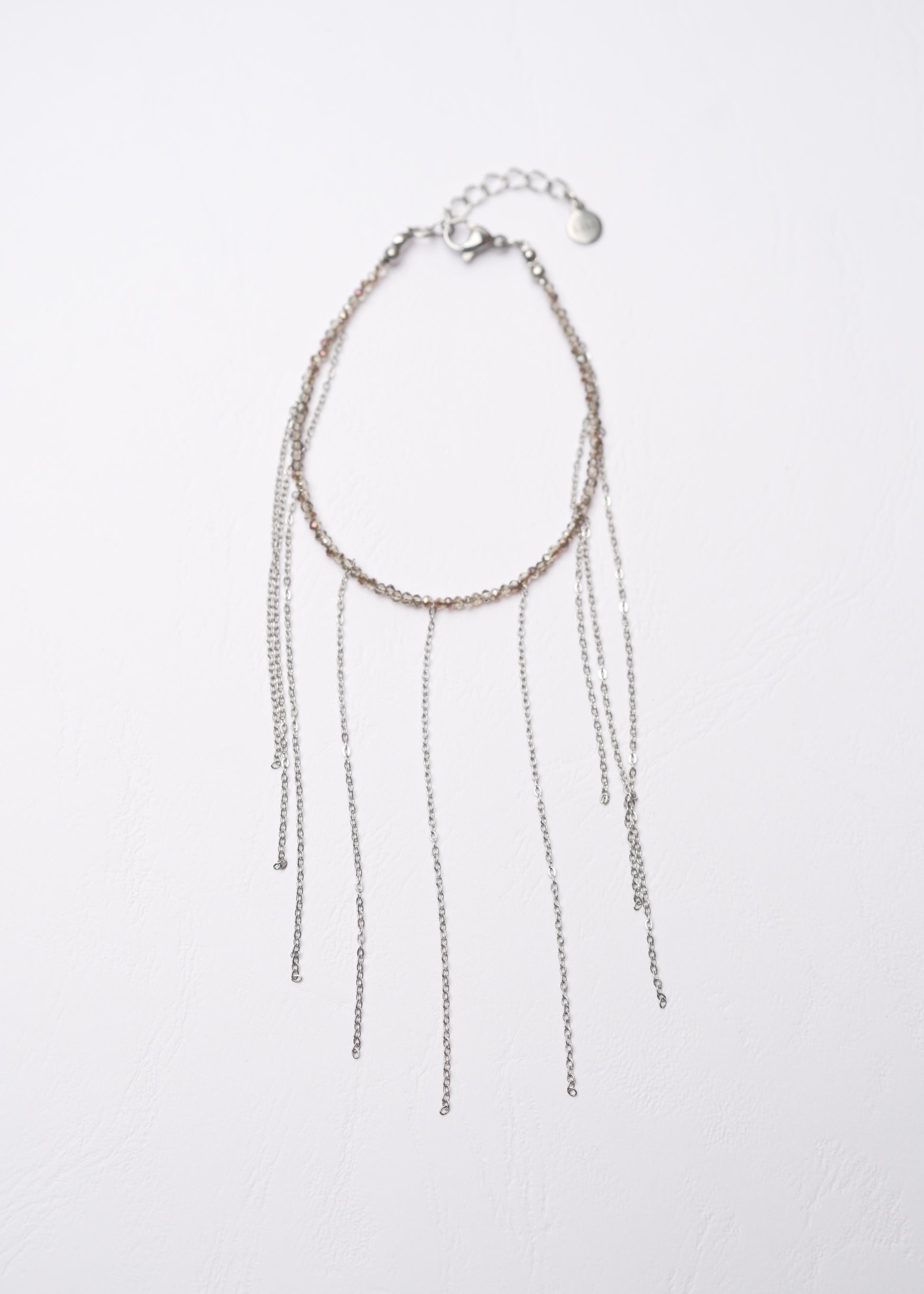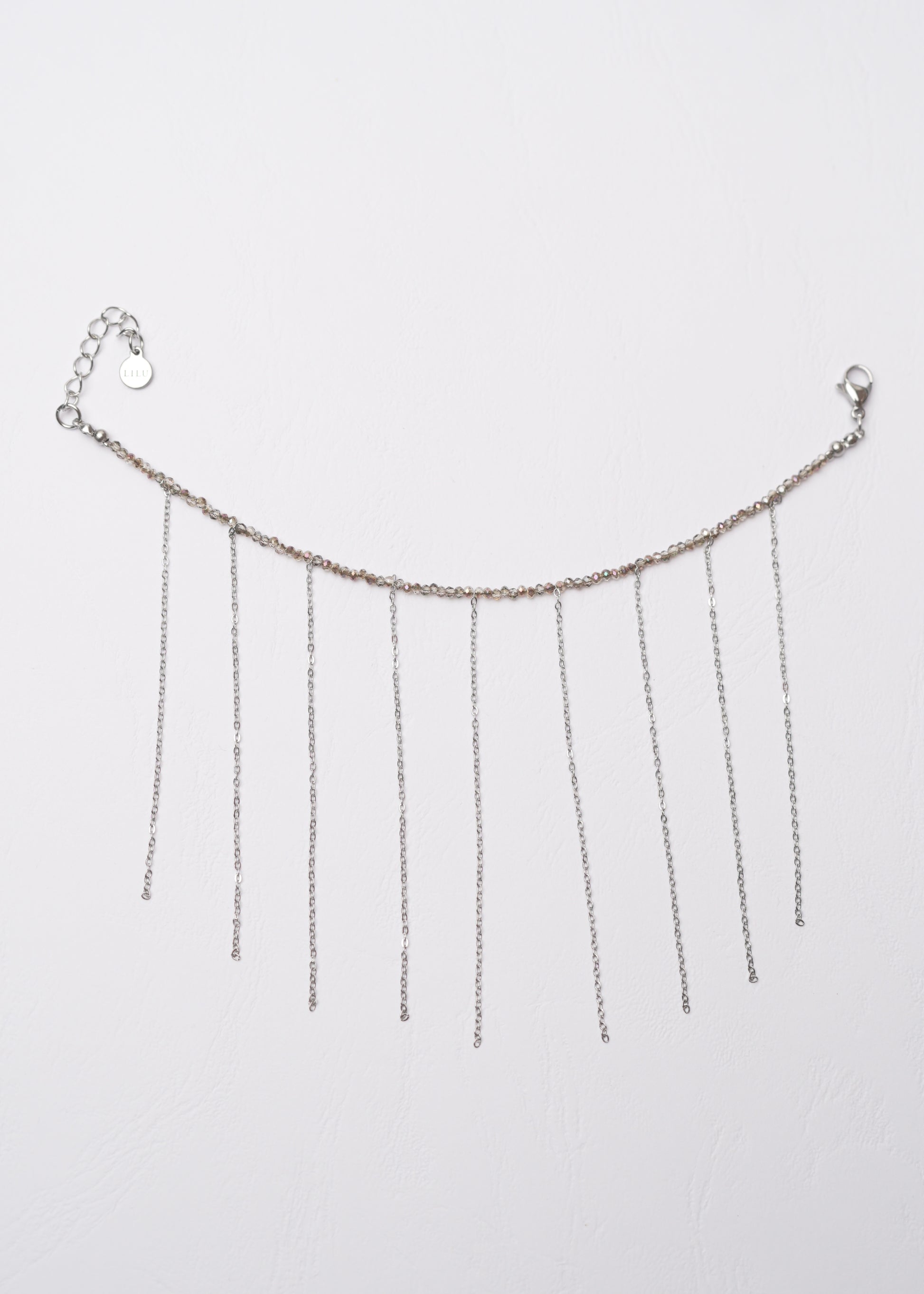 Stylish minimalistic bracelet with sparkling grey beads and long chains.