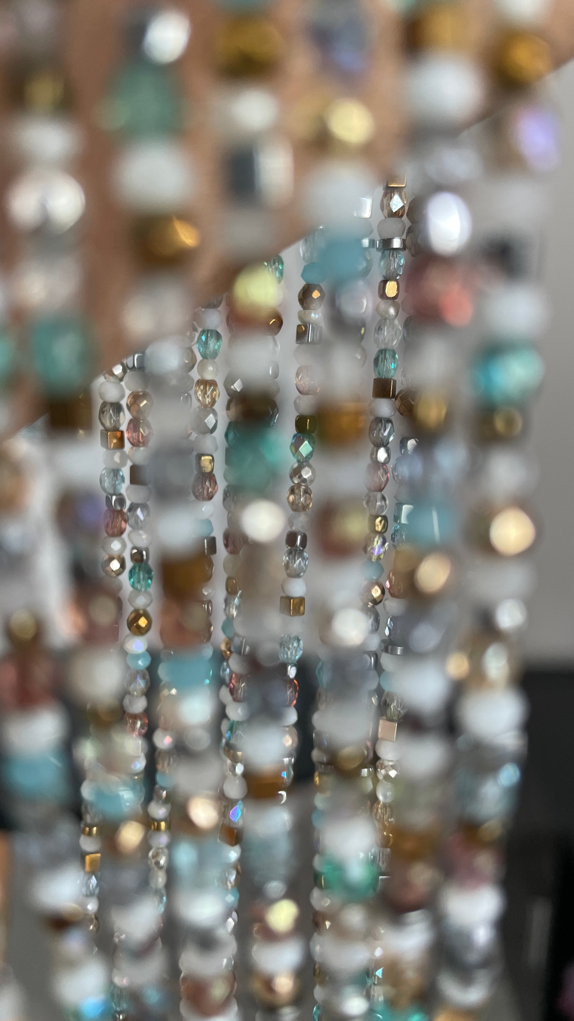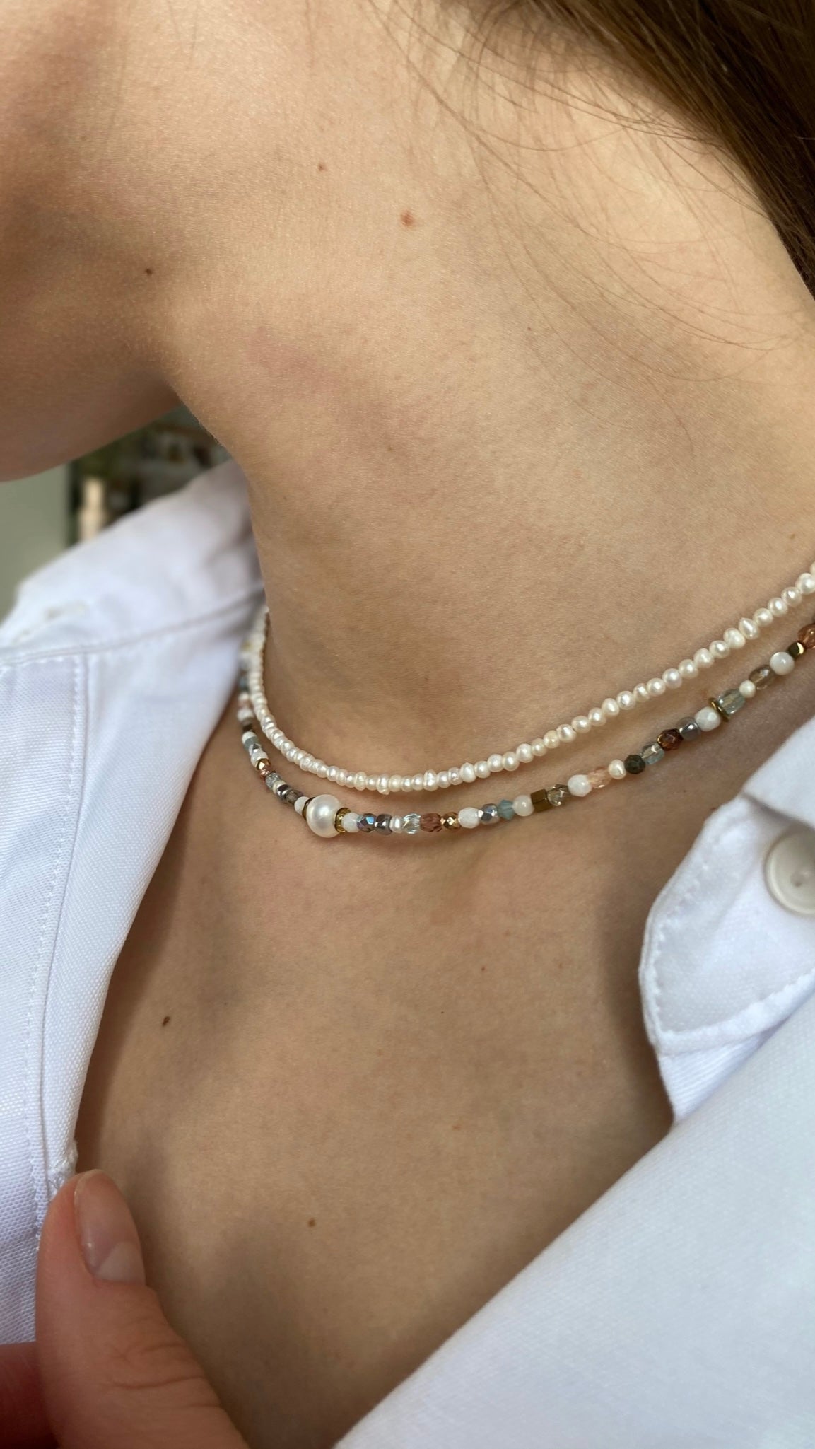 Natural pearls, Czech beads, Swarovski crystals, Japanese seed beads, jewelry stainless steel.