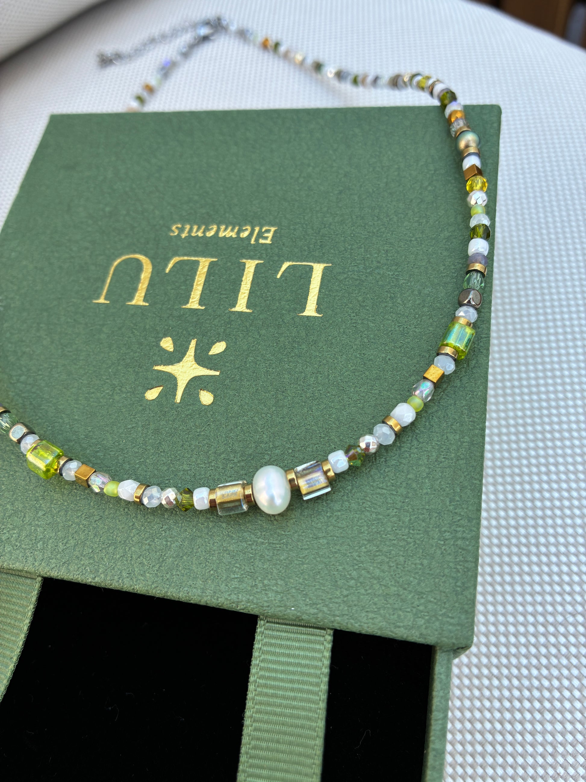 Natural pearls, Czech beads, Swarovski crystals, Japanese seed beads, jewelry stainless steel.