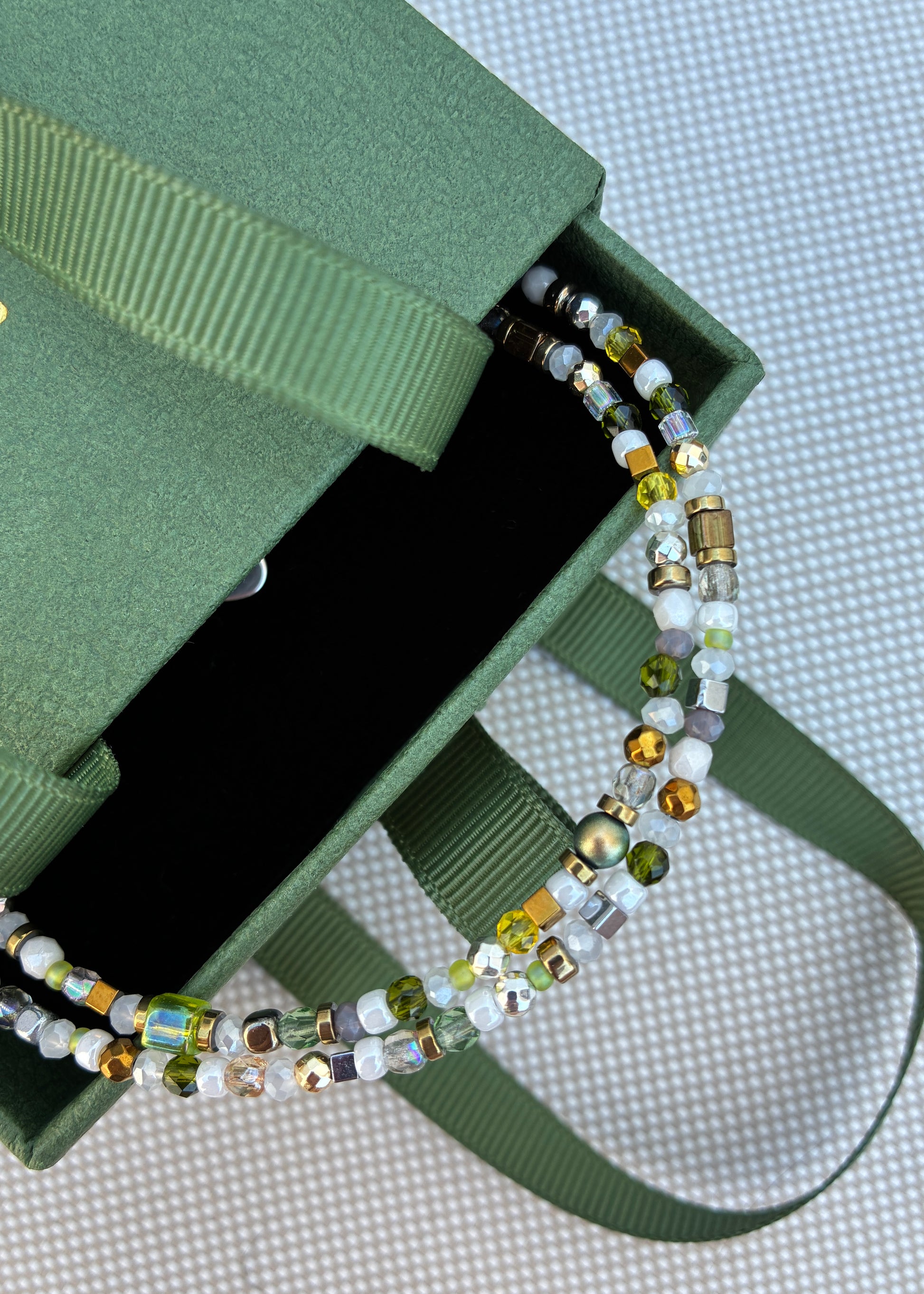 Handmade in green, golden and white colors.