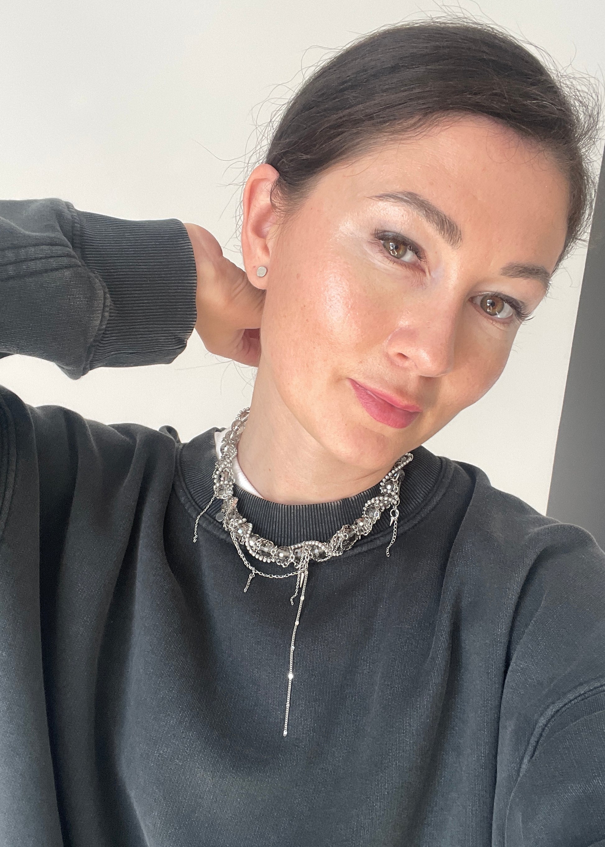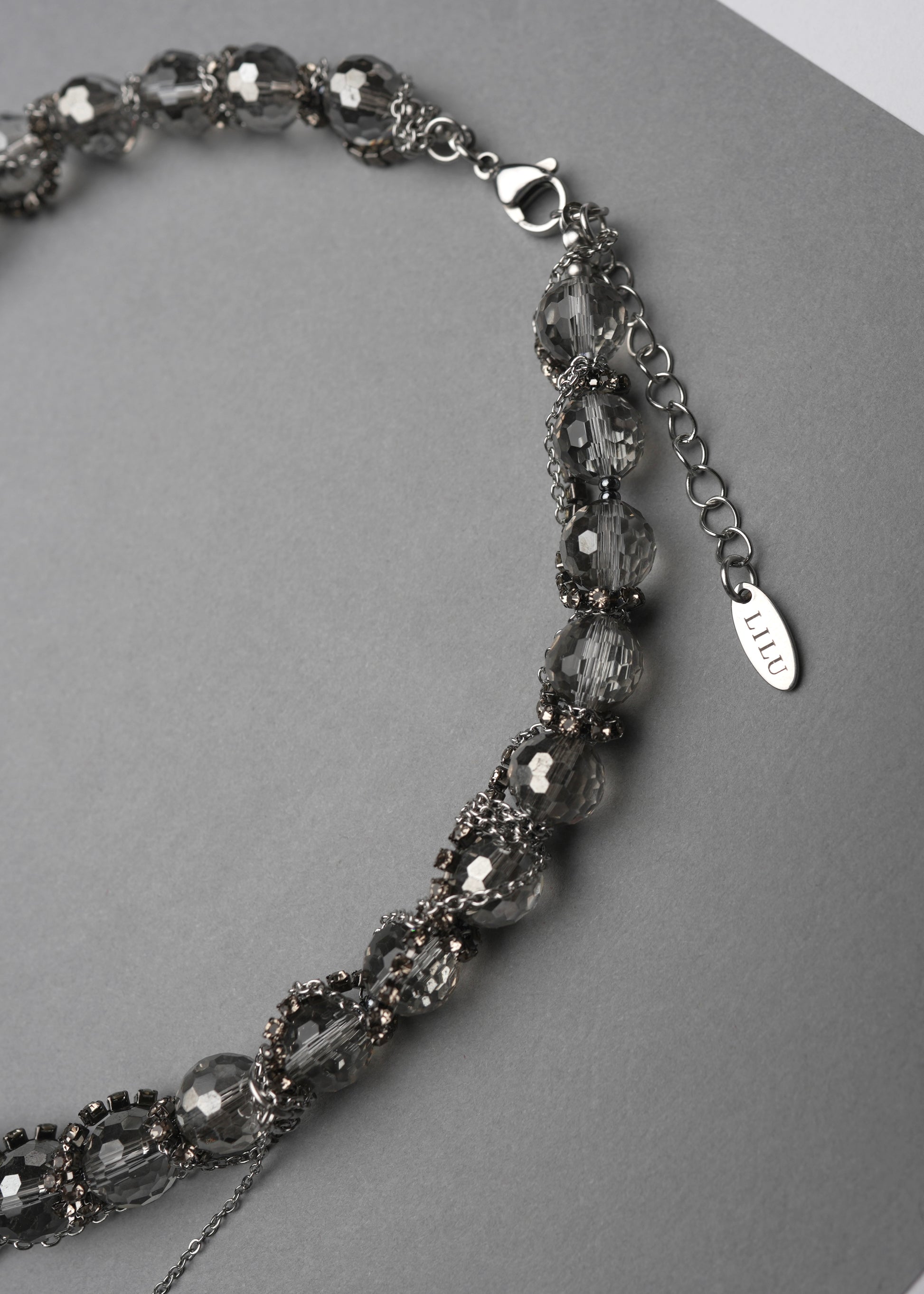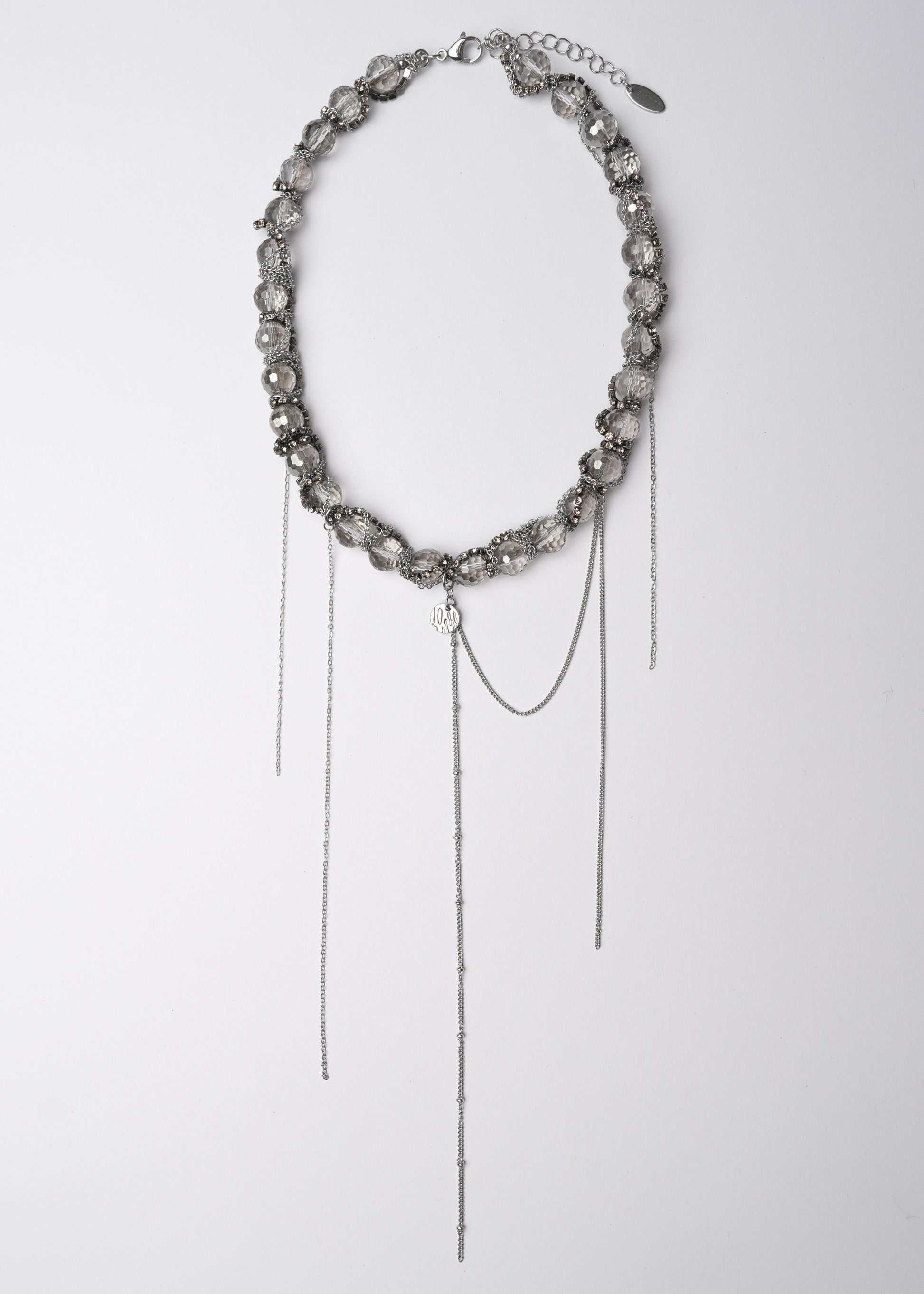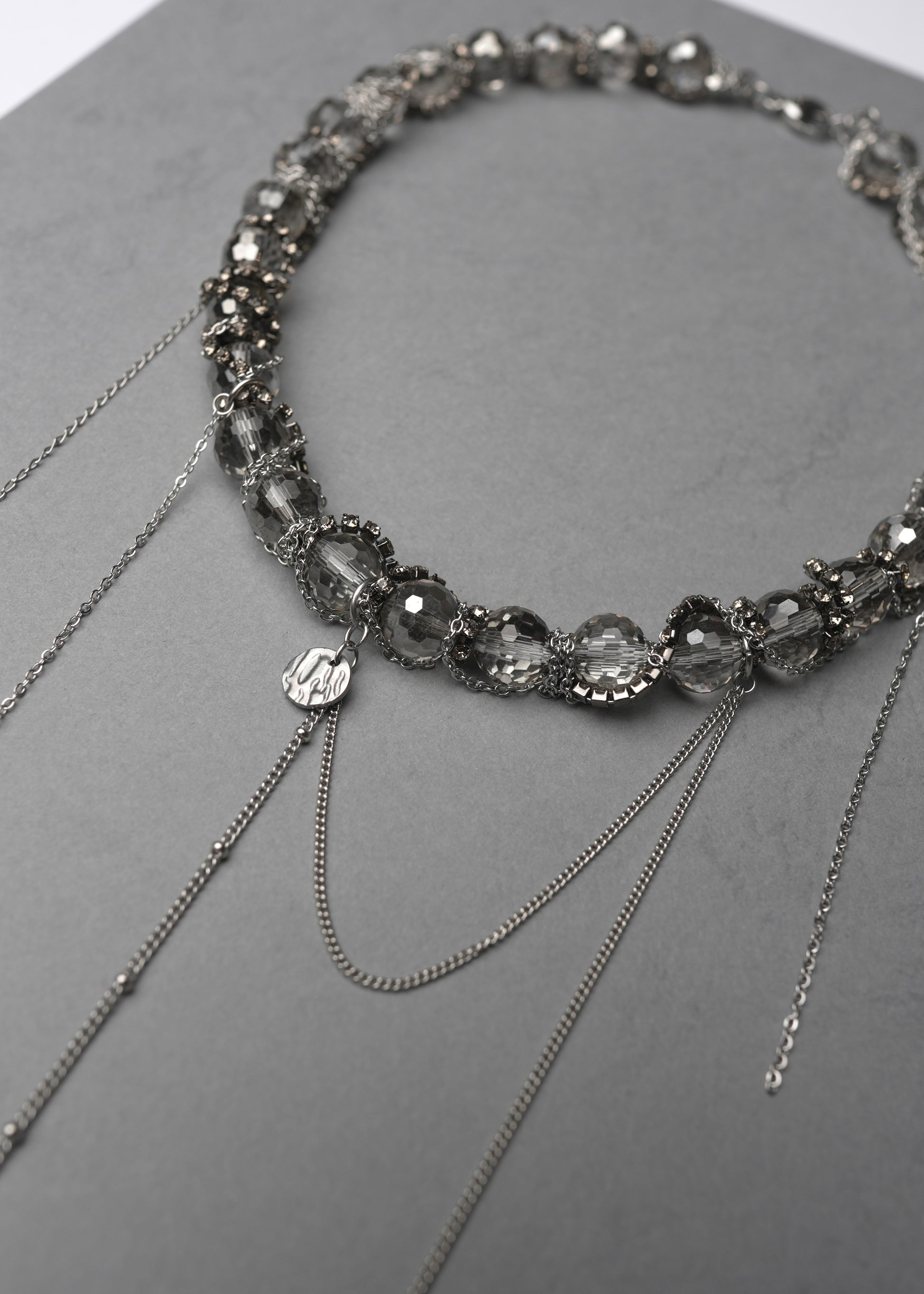 Gorgeous necklace with shiny glass beads and tangled chains effect.